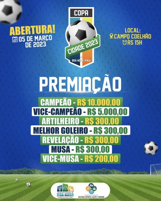 O campeão vai levar 10 mil reais em premiação ofertada pela Prefeitura Municipal de Boa Hora e o vice 5 mil reais. Serão premiados ainda o artilheiro, o melhor goleiro, o jogador revelação, a musa e a vice-musa.