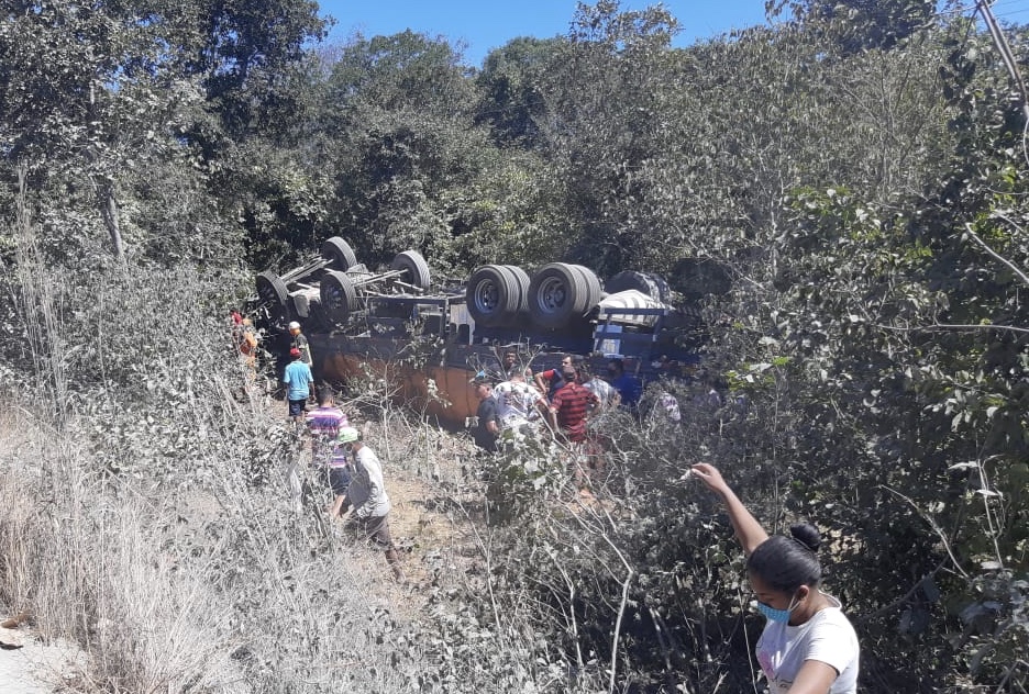 Segundo o Polícia Rodoviária Federal (PRF), o caminhão capotou após uma colisão lateral com outro veículo de grande porte.