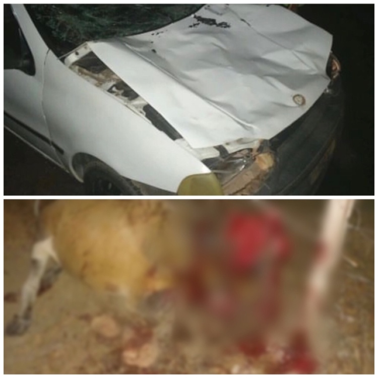 Um homem sob efeito de álcool e armado com um facão desferiu golpes na cabeça de um boi após ele ter provocado um acidente. O carro do homem ficou bastante danificado com impacto da batida.