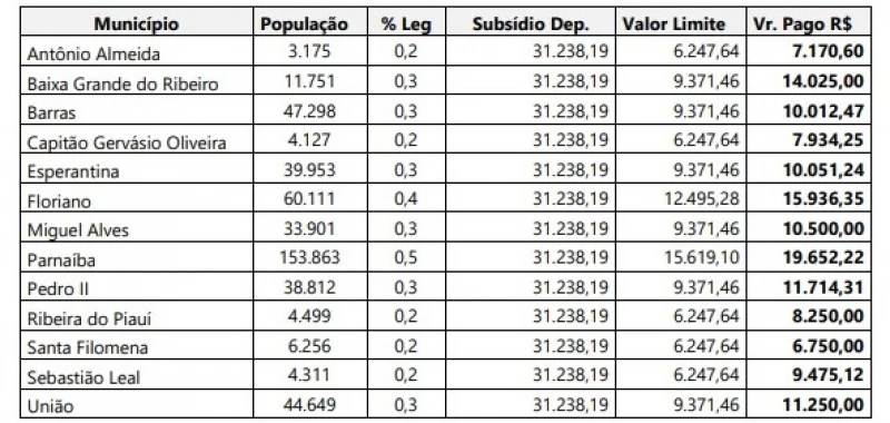 As cidades de 50 mil a 100 mil habitantes, podem pagar aos vereadores até 40% do salário de um parlamentar estadual, que é R$ 12.495,28. Os dois municípios piauienses com mais de 100 mil habitantes, Parnaíba e Teresina, podem pagar salários máximos de R$ 15.619,10 e R$ 23.428,64, respectivamente.