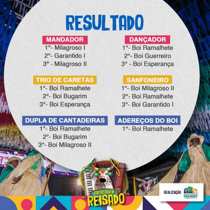 Um corpo de júri composto por 12 jurados julgou as apresentações de mandador de boi; cantadeiras; trio de caretas; dançador; sanfoneiro; e adereço dos bois.