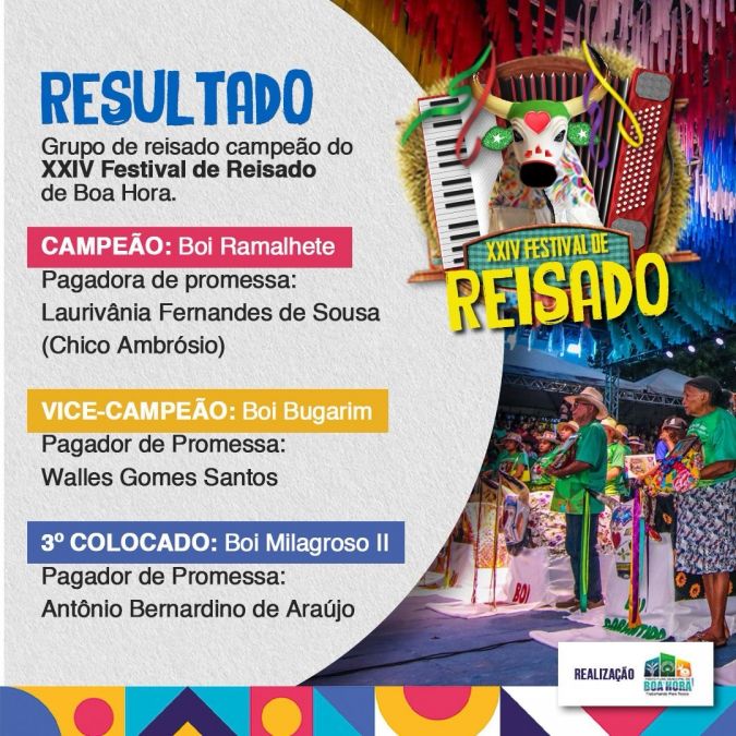 O grupo de reisado Boi Ramalhete da pagadora de Promessa Laurivânia Fernandes do centro de Boa Hora foi o grande vencedor do Festival.