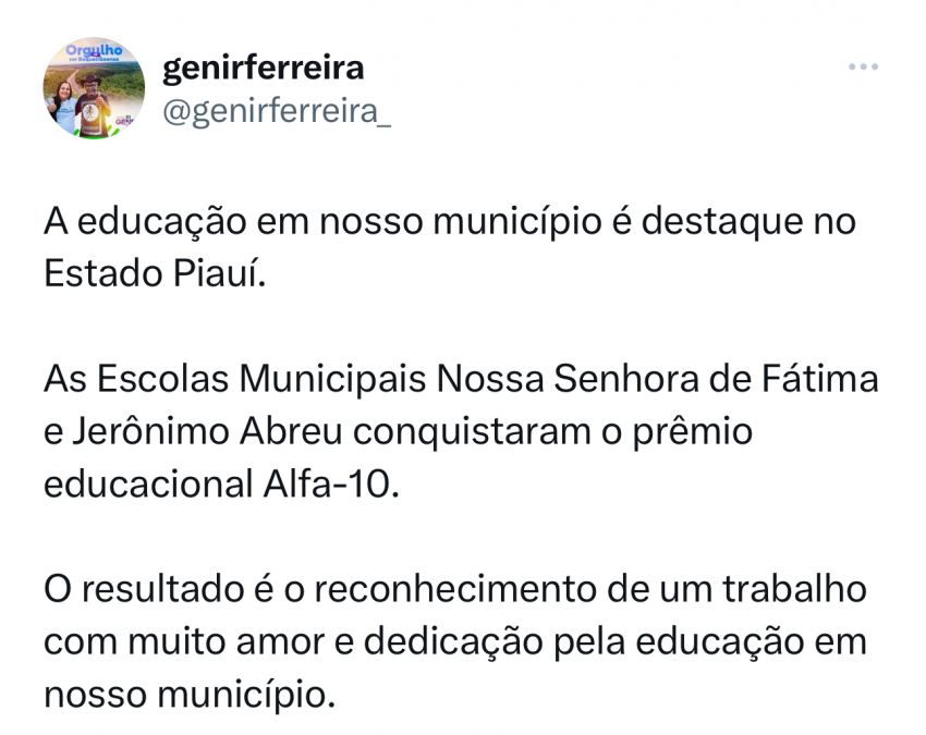 Em sua rede social, a Prefeita de Boqueirão do Piauí Genir Ferreira comemorou a conquista e parabenizou as equipes das duas escolas municipais.