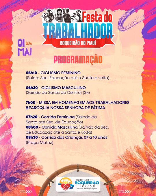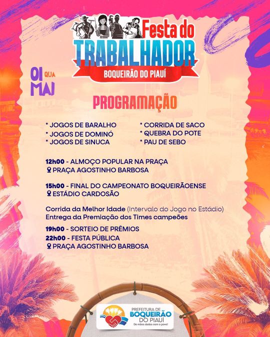 A Prefeitura de Boqueirão do Piauí divulgou a programação da tradicional festa do trabalhado que acontece dia 1º de maio no município.