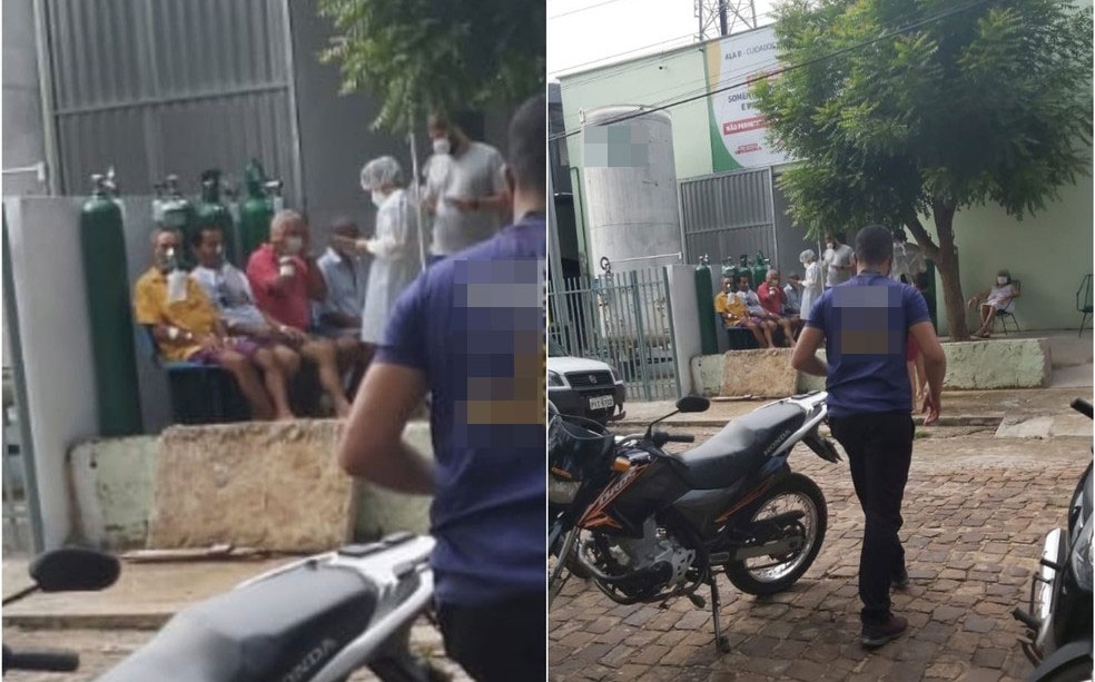 Pacientes com Covid-19 idosos foram vistos, na quinta-feira (11), recebendo oxigênio sem distanciamento na calçada do Hospital Regional Leônidas Melo, em Barras, Norte do Piauí. Eles estavam sentados todos juntos, sem o distanciamento recomendado, o que, segundo o infectologista ouvido pelo G1, Nayro Ferreira, pode provocar um agravamento da doença.