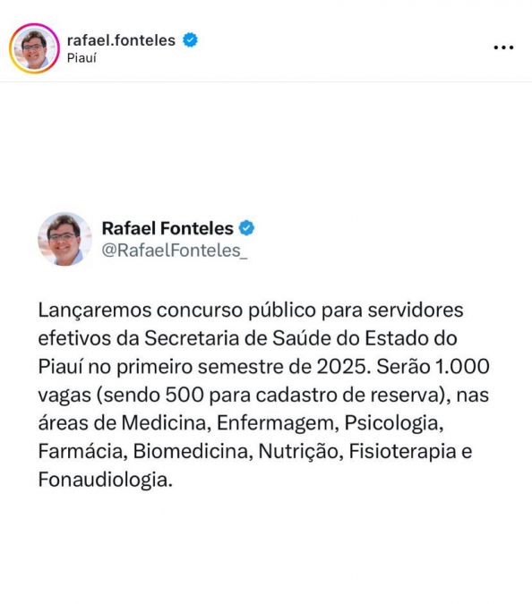 “Lançaremos concurso público para servidores efetivos da Secretaria de Saúde do Estado do Piauí no primeiro semestre de 2025. Serão 1.000 vagas (sendo 500 para cadastro de reserva), nas áreas de Medicina, Enfermagem, Psicologia, Farmácia, Biomedicina, Nutrição, Fisioterapia e Fonoaudiologia”, anunciou o governador.