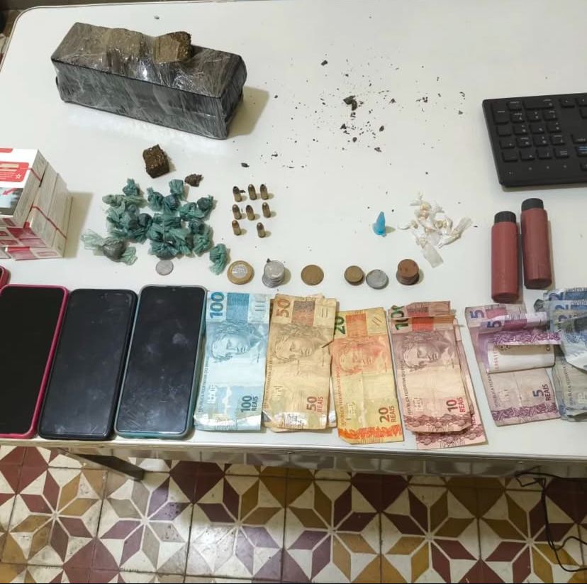 Durante as buscas no local foram abordados 3 índividuos com inicias L.J.S, J.F.M.A e I.G.S. com grande quantidade de drogas (aproximadamente 2kg de maconha), 9 porções de crack, 8 carteira de cigarro, 4 celulares, 2 tablet grande de maconha, 3 porções média de maconha, 20 trouxas de maconha, 8 munições calibre 32, 1 porção de pólvora e chumbo, 1 porção de cocaína, R$ 297,15 em dinheiro. Diante dos fatos, os três envolvidos foram presos e conduzidos à Delegacia da Polícia Militar, junto com o material apreendido.