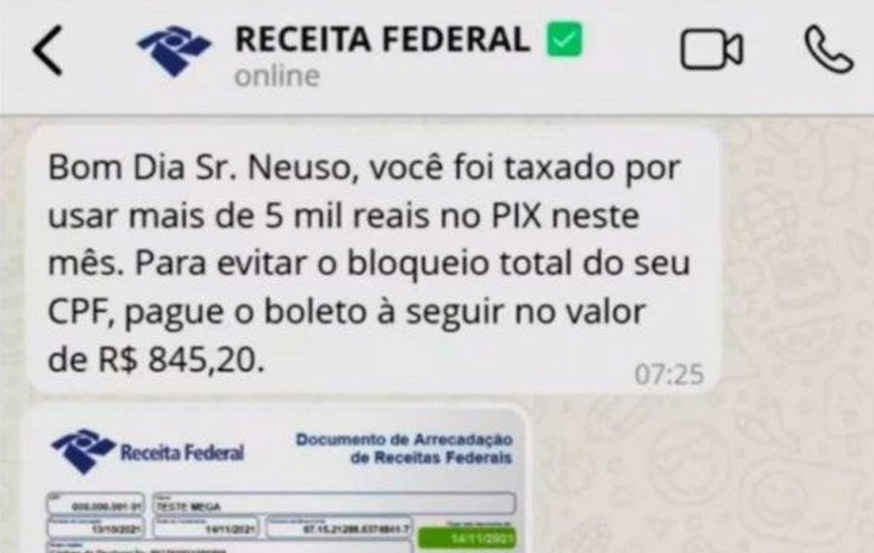 Nas mensagens, os criminosos se passam por representantes da instituição e abordam possíveis vítimas dizendo que há uma suposta cobrança de taxas sobre transações via PIX em valores acima de R$ 5 mil e, por isso, pedem que um boleto seja pago. Os golpistas ainda ameaçam bloquear o CPF caso a pessoa não pague o boleto.
