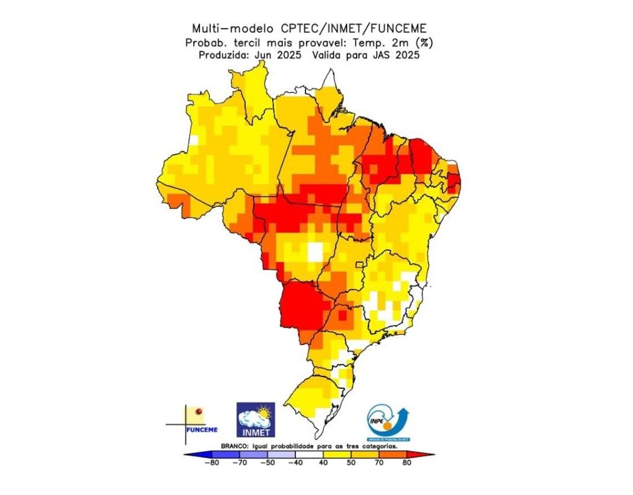 Para o período entre agosto e outubro, as temperaturas podem ficar até 2?C acima da média no Piauí, especialmente na região norte. O dado multimodelo produzido pelo CPTEC (Centro de Previsão de Tempo e Estudos Climáticos) do INPE (Instituto Nacional de Pesquisas Espaciais) e pela Funceme (Fundação Cearense de Meteorologia e Recursos Hídricos) indica que, já no mês de julho, a região do extremo sul do Estado está 1,5?C acima da média.