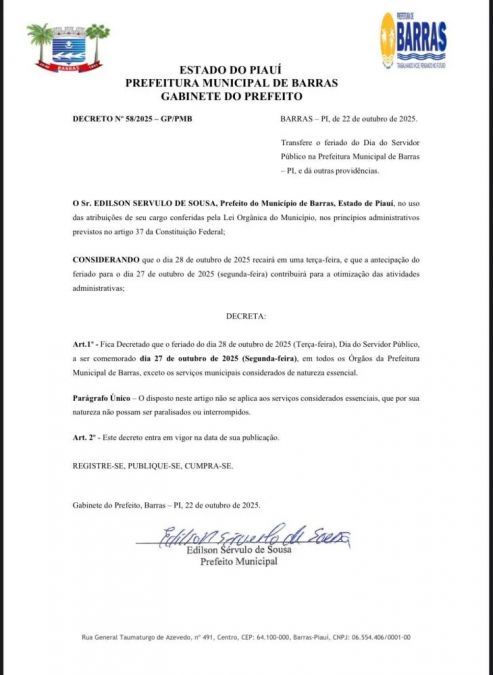A Prefeitura de Barras antecipou para segunda-feira (27) o ponto facultativo referente ao Dia do Servidor Público, tradicionalmente comemorado em 28 de outubro. A mudança foi oficializada por meio de decreto publicado no Diário Oficial do Município.