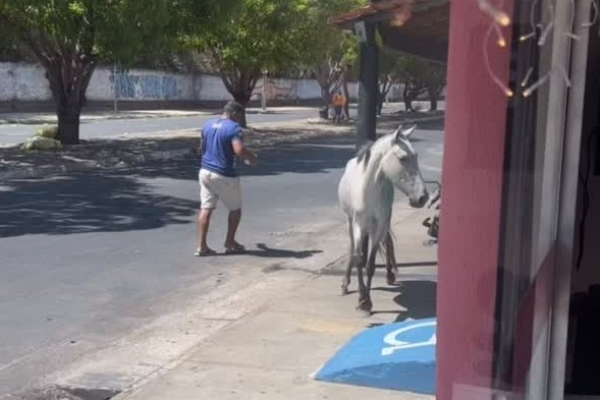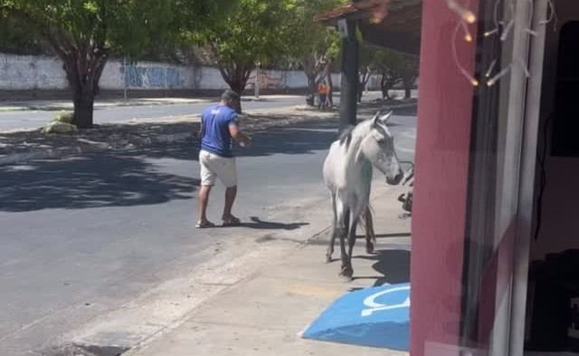 Nas imagens, o animal aparece se aproximando da porta do salão e tenta entrar mais uma vez, mas acaba esbarrando em uma motocicleta estacionada na entrada. Um homem que passava pelo local ajuda a afastar o cavalo, que insiste por alguns segundos antes de desistir e ir embora.
