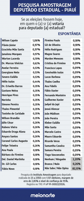 Uma pesquisa do Instituto Amostragem sobre a disputa para deputado estadual no Piauí aponta o pré-candidato Wilson Capote na liderança da intenção de voto espontânea, com 1,06%.